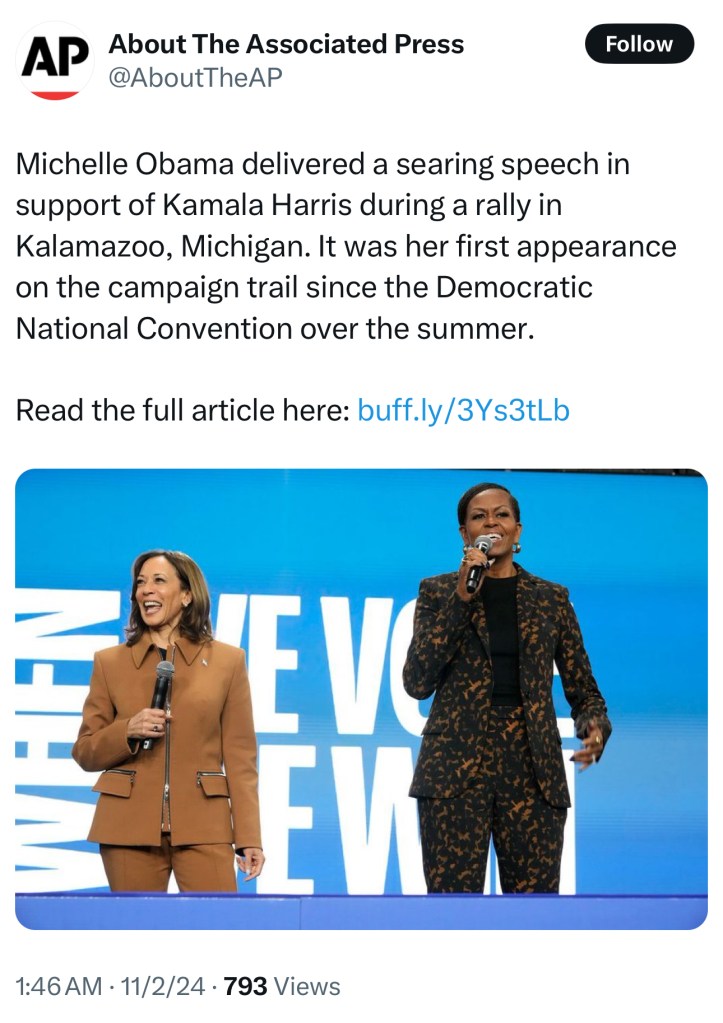 On October 26th, 2024, former first lady Michelle Obama spoke to an energized crowd at a rally for presidential candidate Kamala Harris in Kalamazoo, Michigan. In her remarks, Obama emphasized the gravity of the upcoming election, urging voters to consider the high stakes of the race and the potential consequences of supporting Harris’ opponent, former President Donald J. Trump, while reminding the audience to “Do something.”